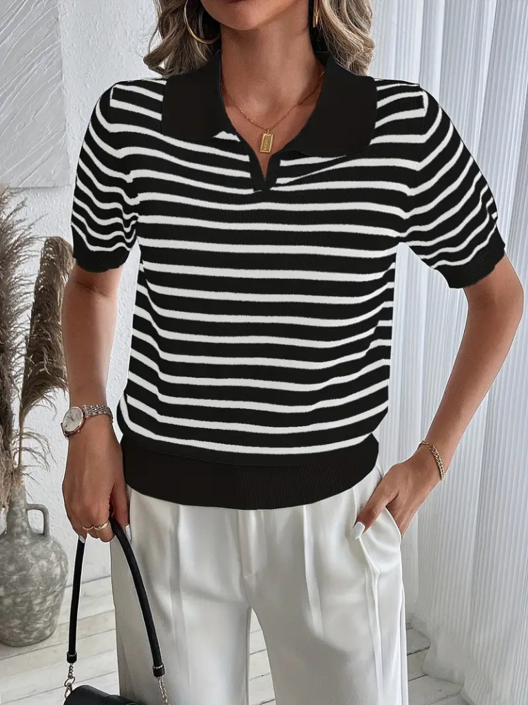 Kadın Kısa Kol Polo Yaka çizgi Desen Triko Bluz