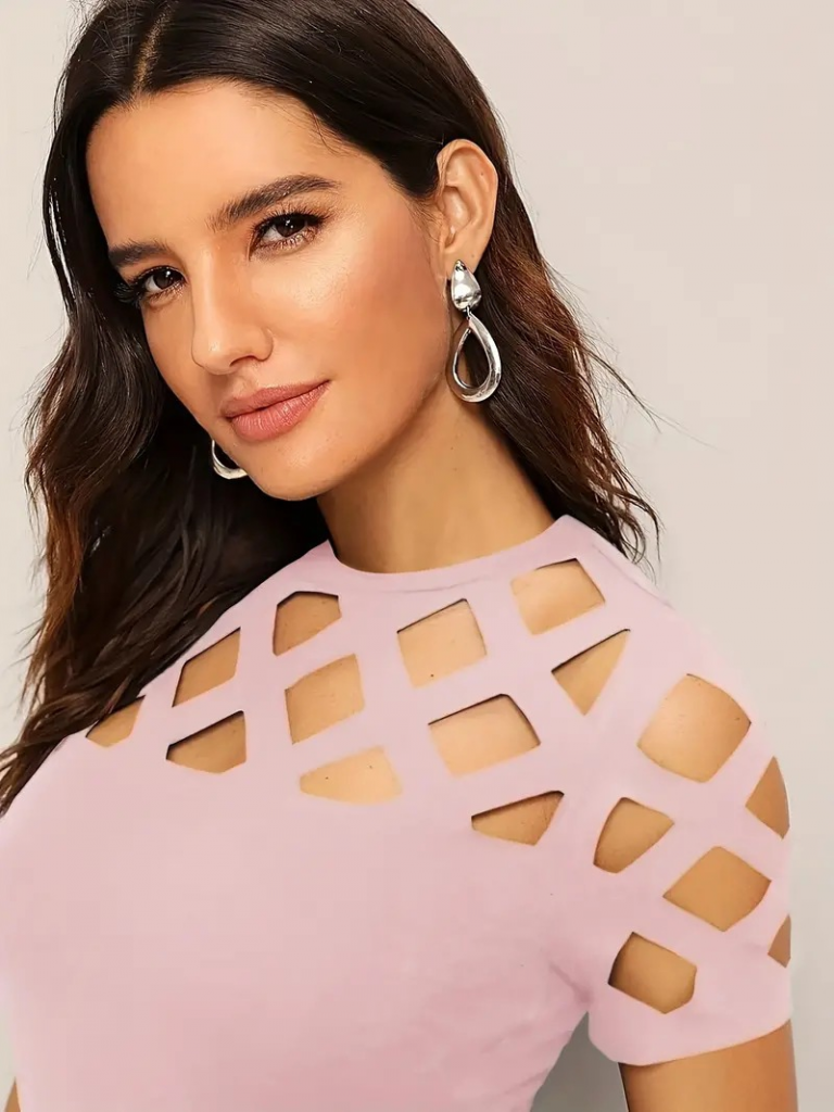 Kadın Kısa Kollu Baklava Desen Lazer Kesim Ithal Krep Bluz