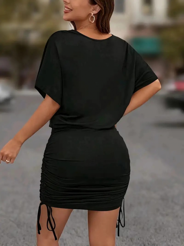 Kadın Kısa Kollu Bisiklet Yaka Yanlardan Büzgülü Kısa Viskon Elbise