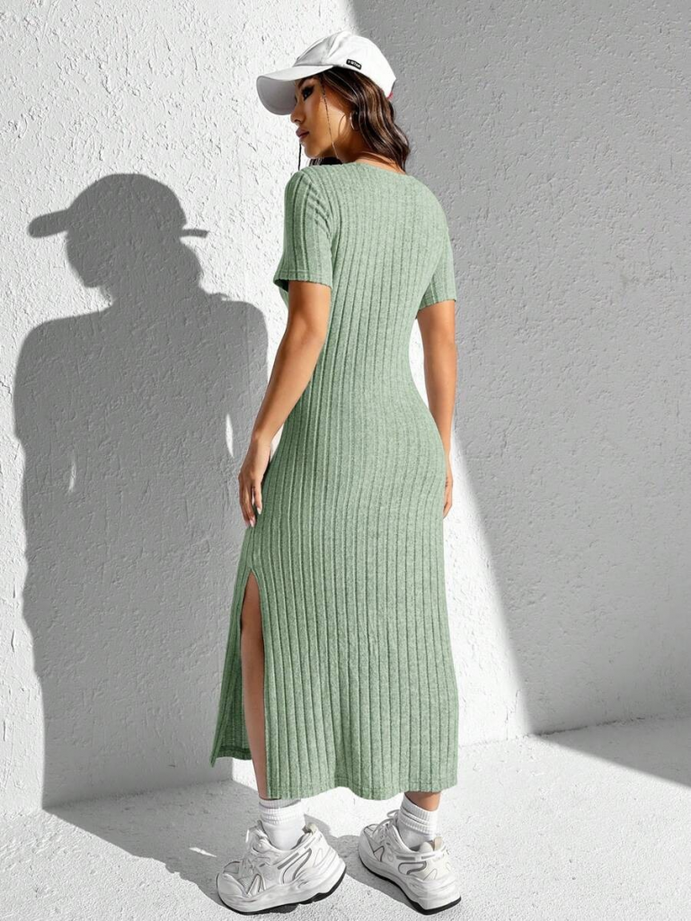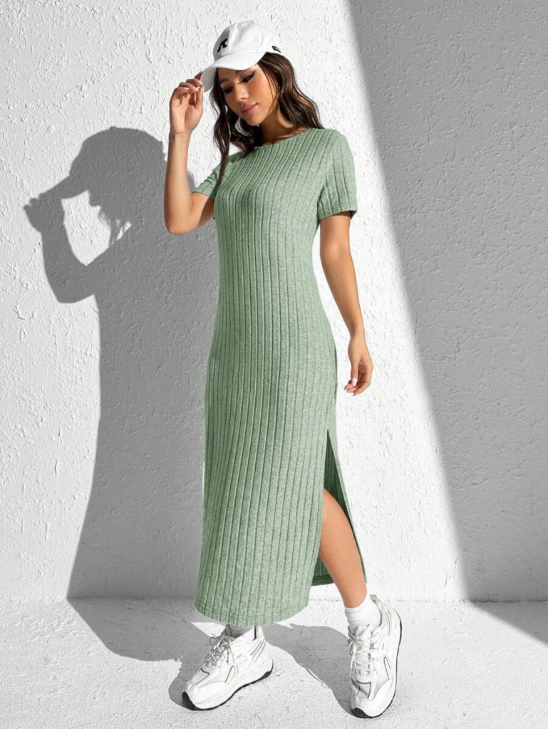 Kadın Kısa Kollu Bisiklet Yaka Yırtmaç Detay Fitilli Kaşkorse Tam Boy Elbise