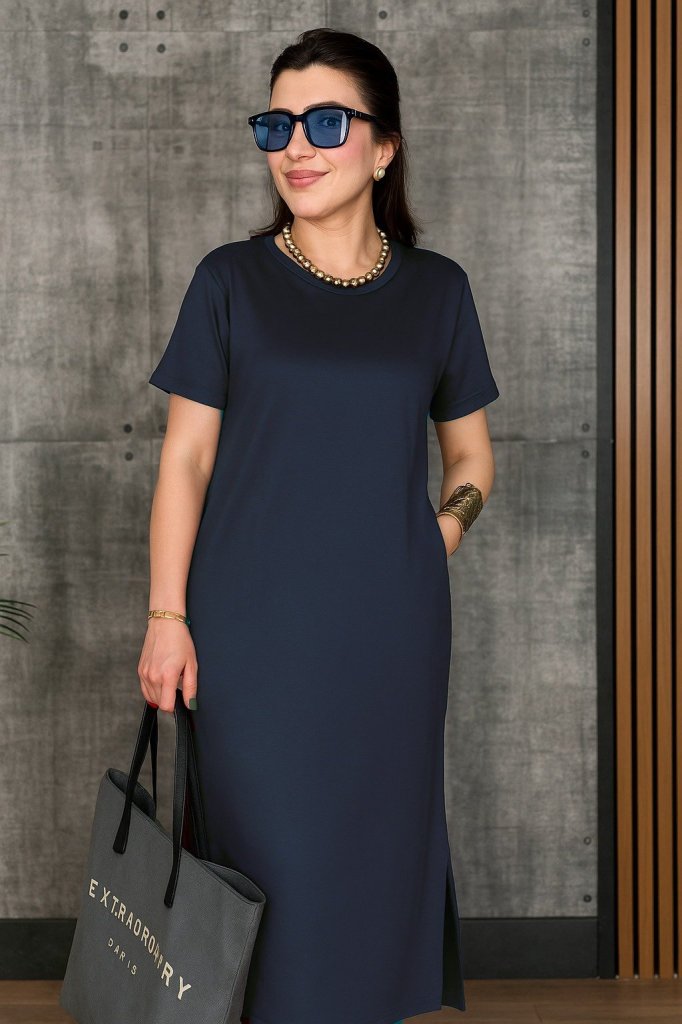 Kadın Kısa Kollu Bisiklet Yaka Yırtmaçlı Viskon Iki Iplik Elbise
