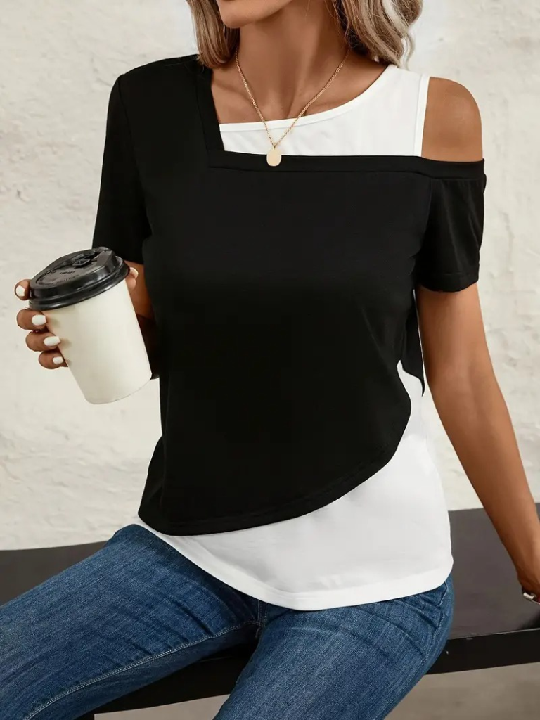 Kadın Kısa Kollu Geometrik Kesin Detaylı çift Renkli Viskon Bluz