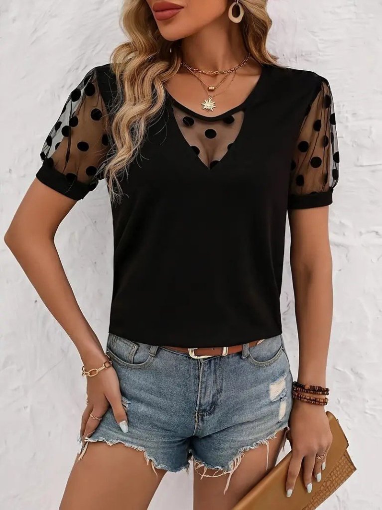 Kadın Kısa Kollu Göğüs Damla Ve Puantiyeli Tül Detaylı Viskon Bluz