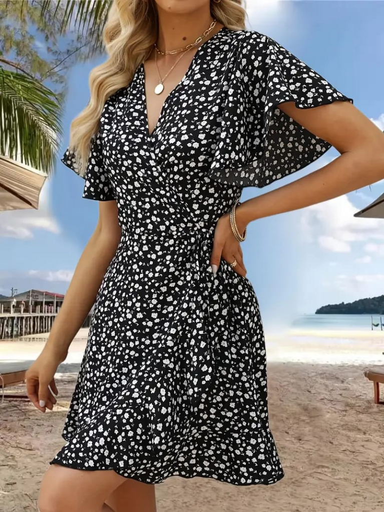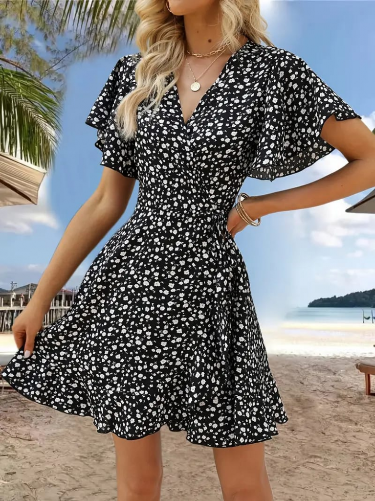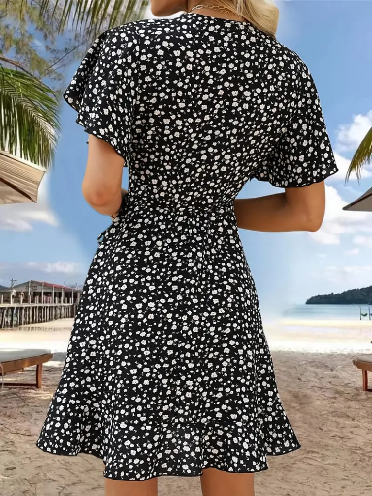 Kadın Kısa Kollu Kolu Ve Eteği Volanlı Fırfırlı çiçek Desenli Mini Elbise