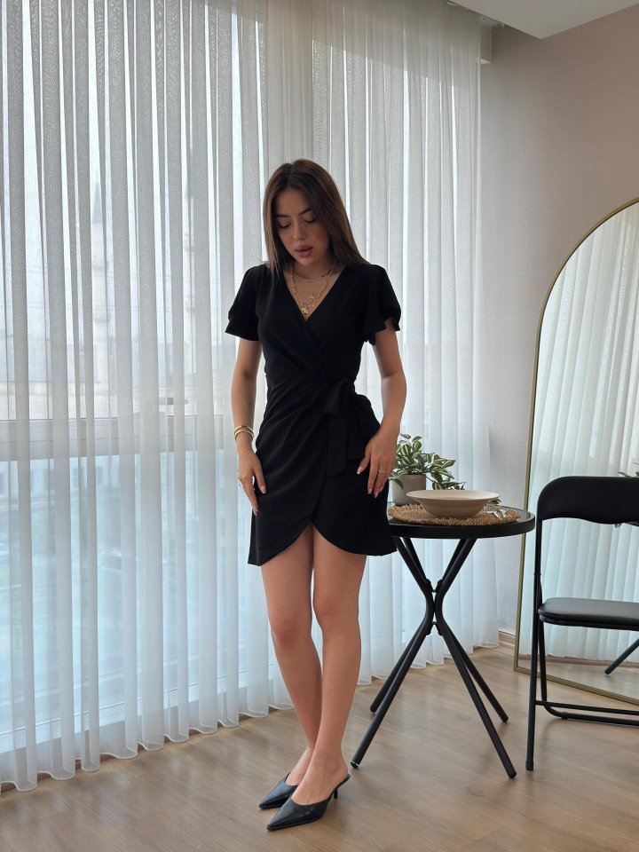Kadın Kısa Kollu Kruvaze Yakalı Belden Bağlamalı Ithal Krep Elbise