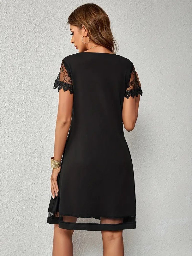 Kadın Kısa Kollu Lazer V Yakalı Etek Ucu Tül Detaylı Janjan Krep Elbise