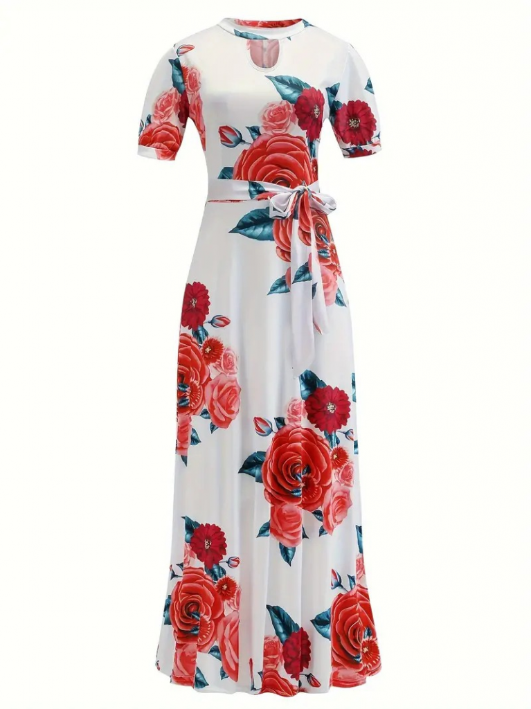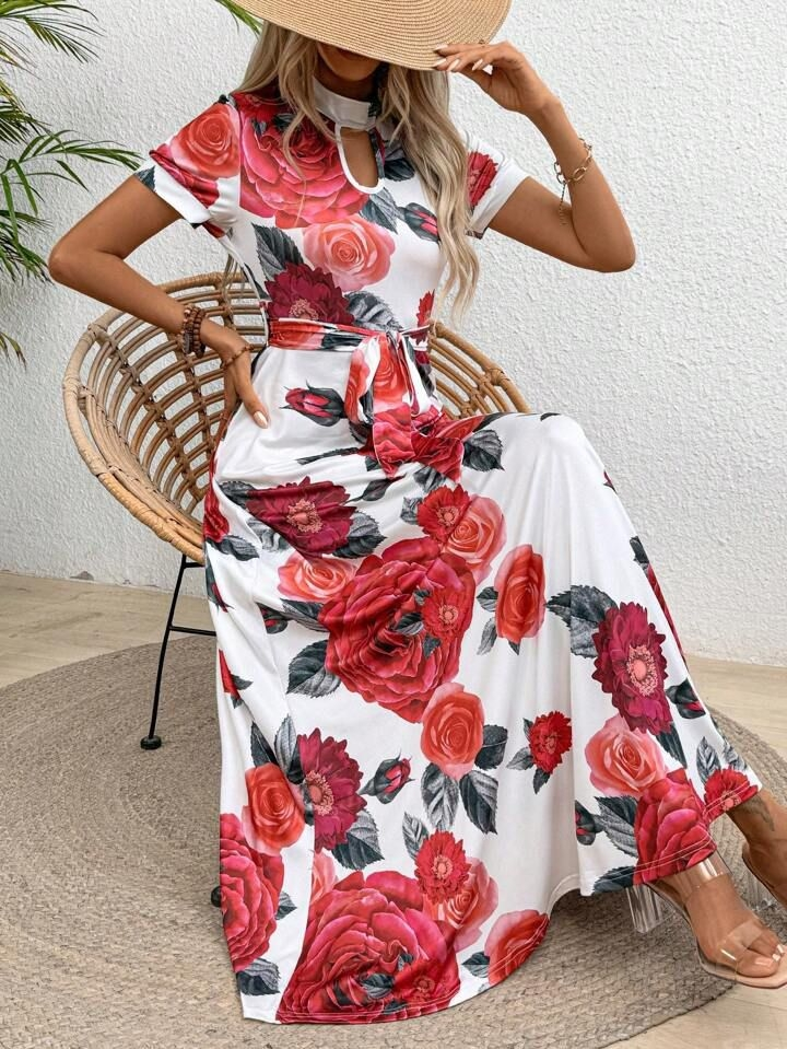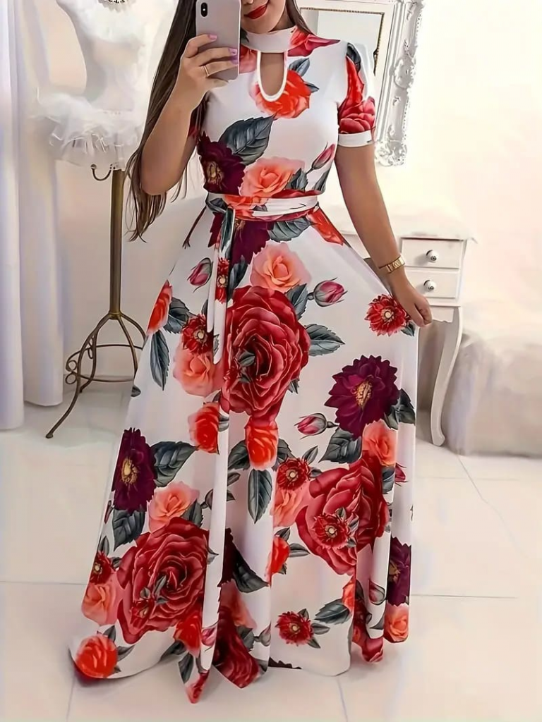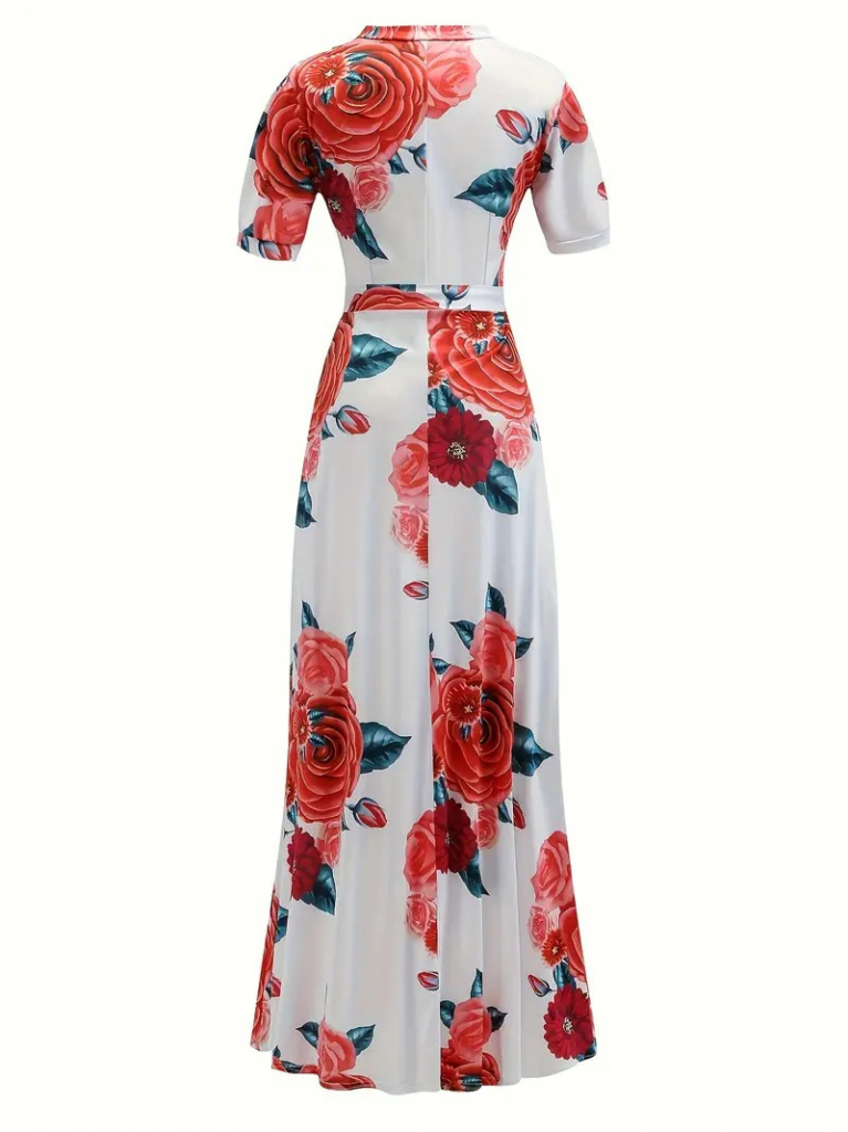 Kadın Kısa Kollu Pencere Detay Gül Baskılı Tam Boy Kiloş Elbise