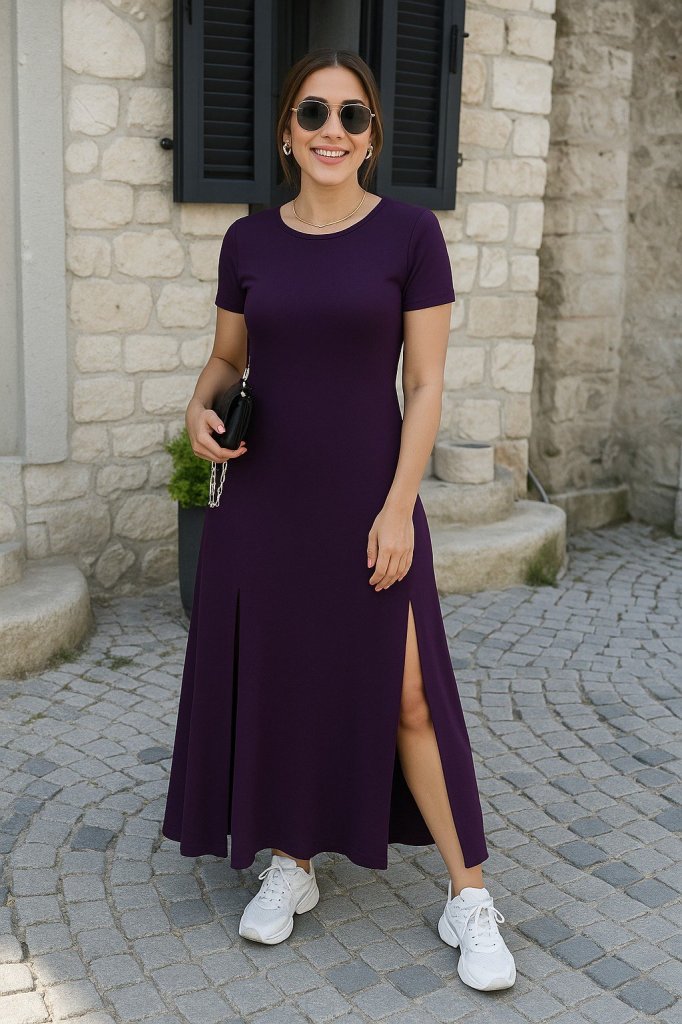 Kadın Kısa Kollu Sırt Dekolteli Yırtmaç Detaylı Viskon Elbise