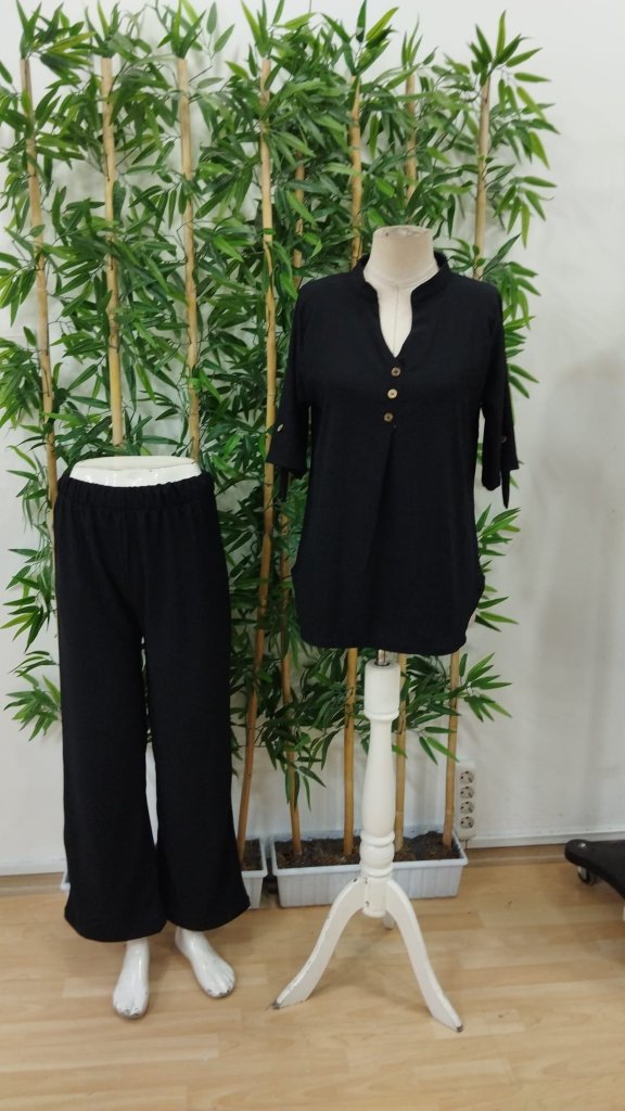 Kadın Kısa Kollu V Hakim Yaka Düğmeli Bürümcük Bluz Ve Pantolon Ikili Takım