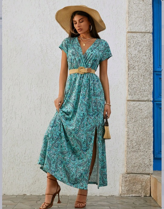 Kadın Kısa Kollu V Yaka Etnik Desenli Yırtmaç Detay Süprem Elbise (kemersiz)