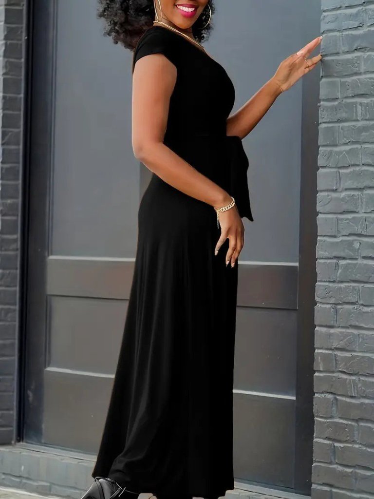 Kadın Kısa Kollu V Yakalı Belden Kuşaklı Maksi Boy Viskon Elbise