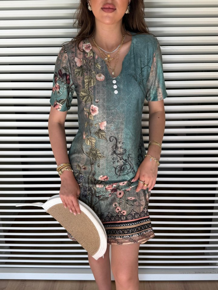 Kadın Kısa Kollu V Yakalı çiçek Baskılı Midi Süprem Elbise