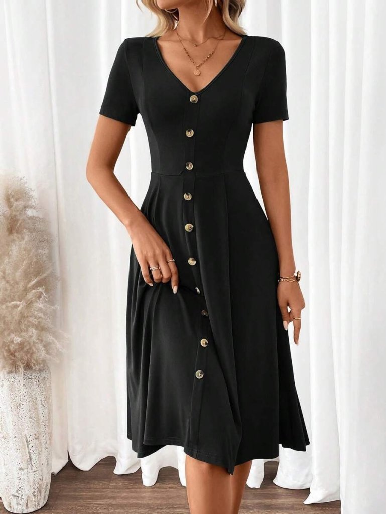 Kadın Kısa Kollu V Yakalı önden Düğmeli A Kesim Dokuma Elbise
