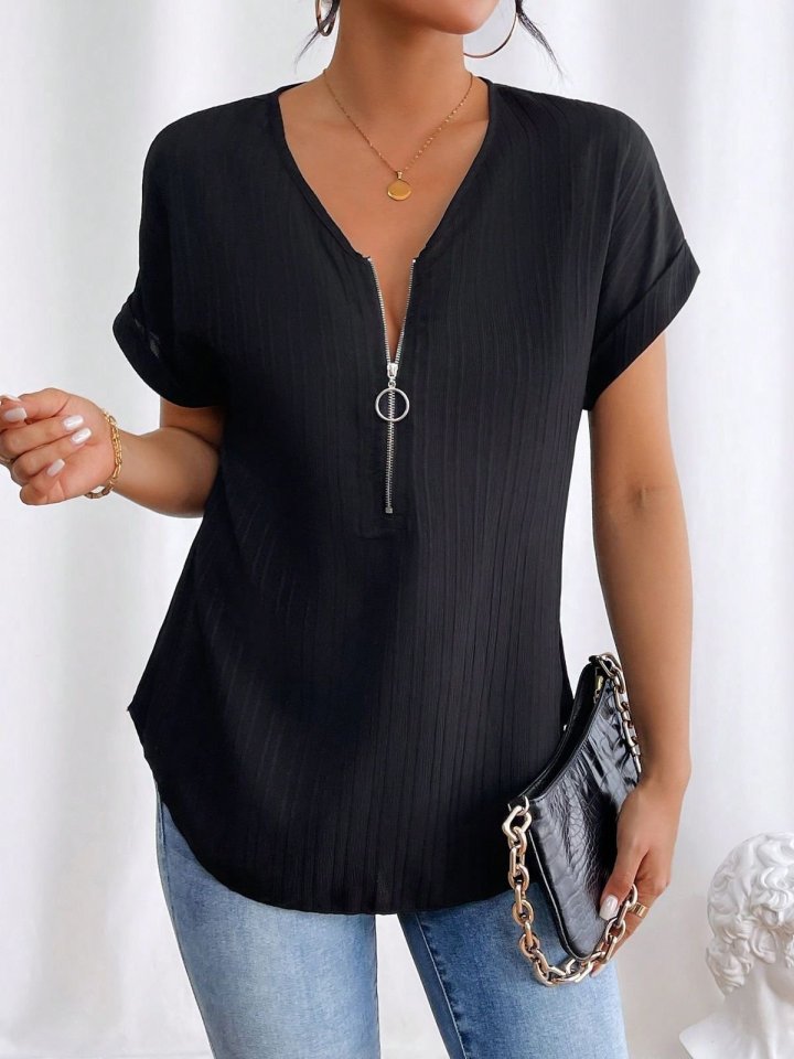 Kadın Kısa Kollu V Yakalı önden Fermuarlı Salaş Bluz