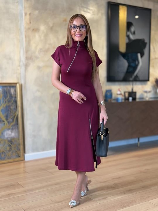 Kadın Kısa Kollu Yakadan Ve Etekten Fermuarlı Midi Viskon Iki Iplik Elbise
