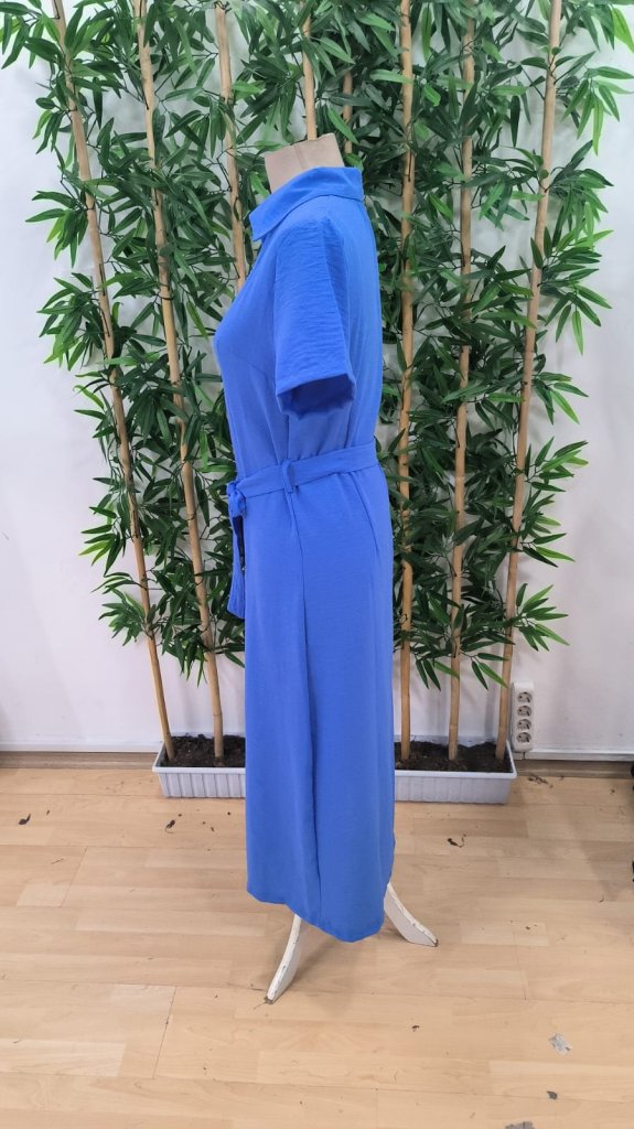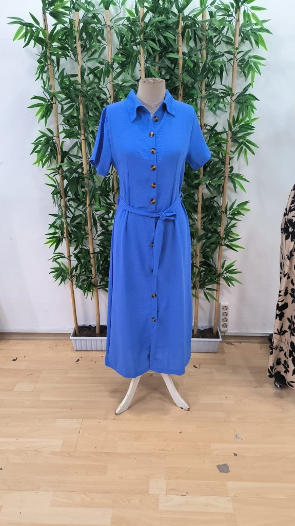 Kadın Kısa Kollu Yakalı önden Düğmeli Beli Kuşaklı Ithal Keten Elbise