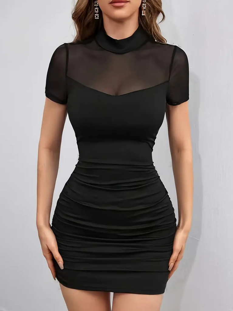 Kadın Kısa Kollu Yarı Balıkçı Yaka Tül Detaylı Kısa Janjan Krep Elbise