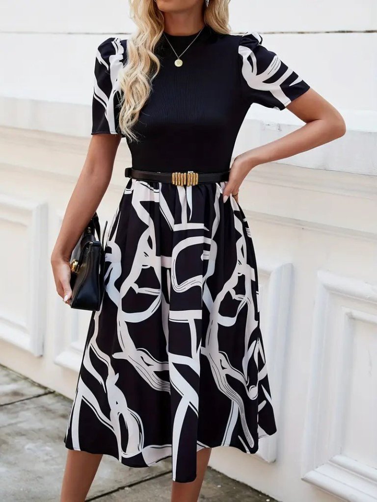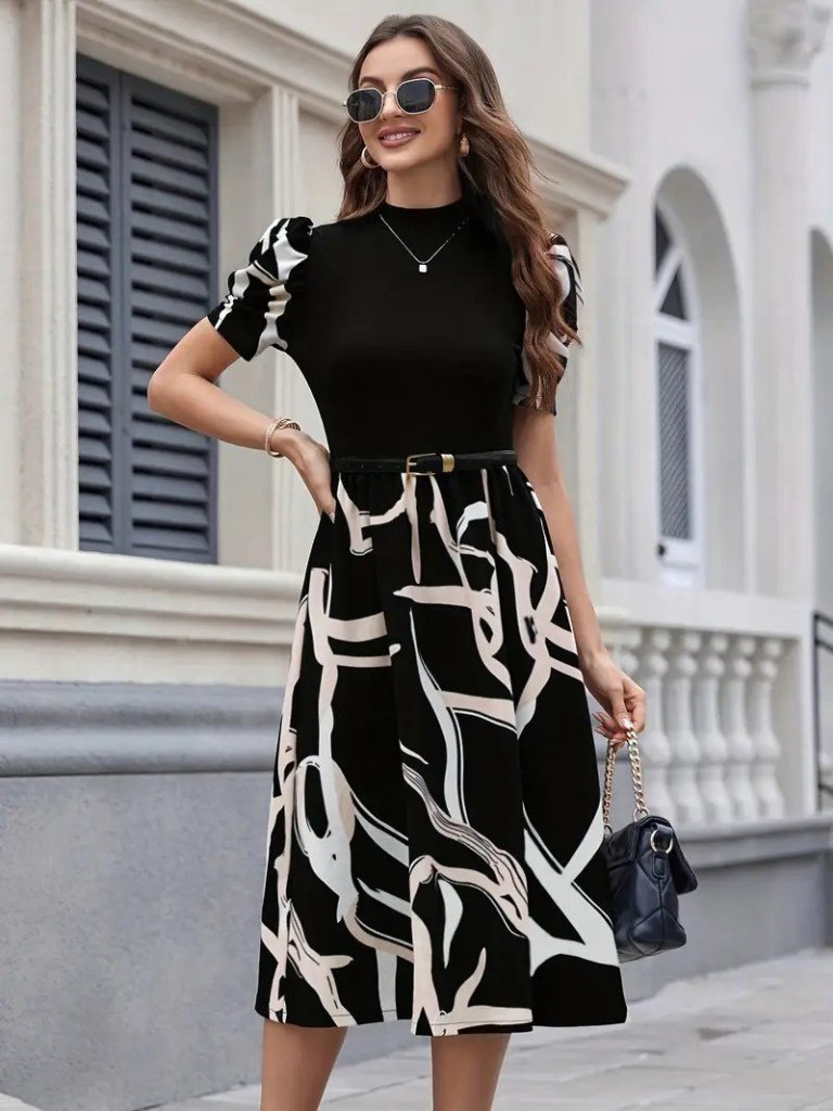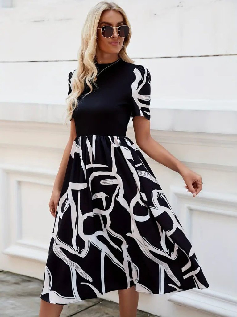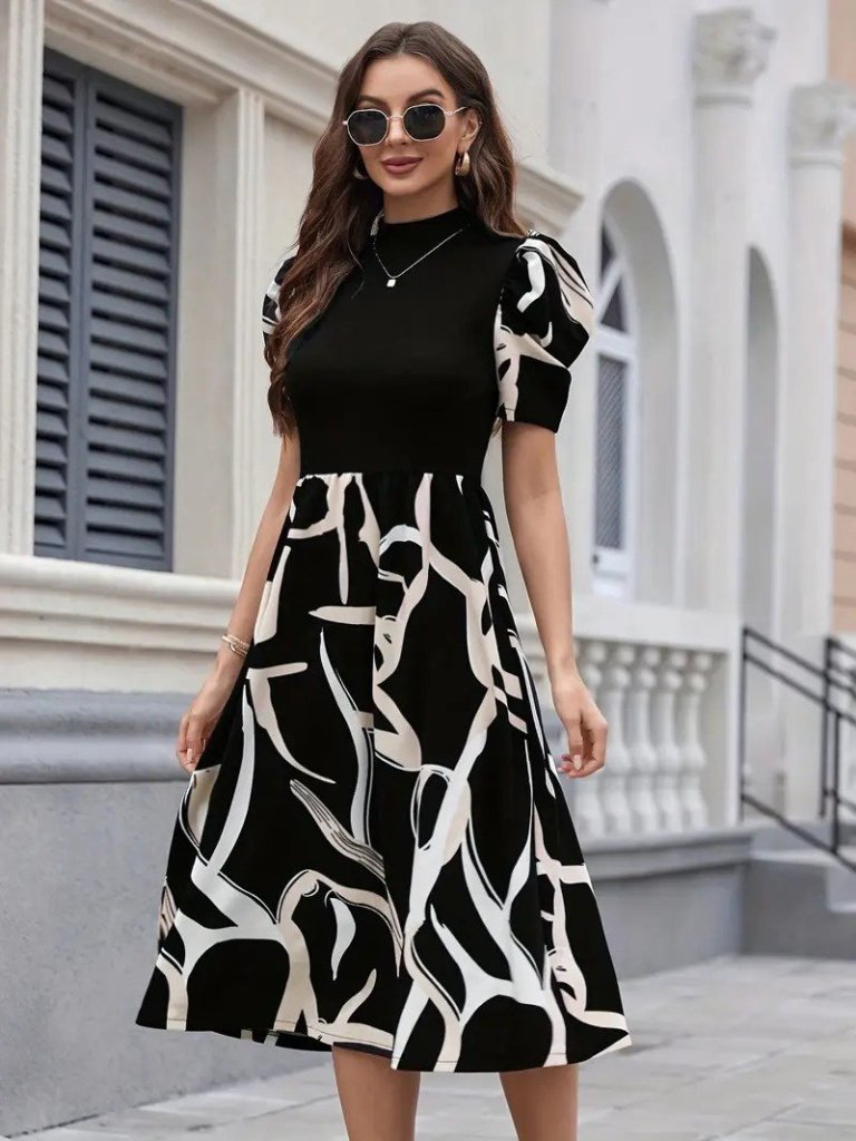 Kadın Kısa Kollu Yarı Balıkçı Yaka üst Viskon Alt Desenli Dokuma Midi Elbise