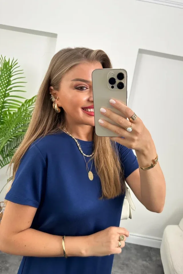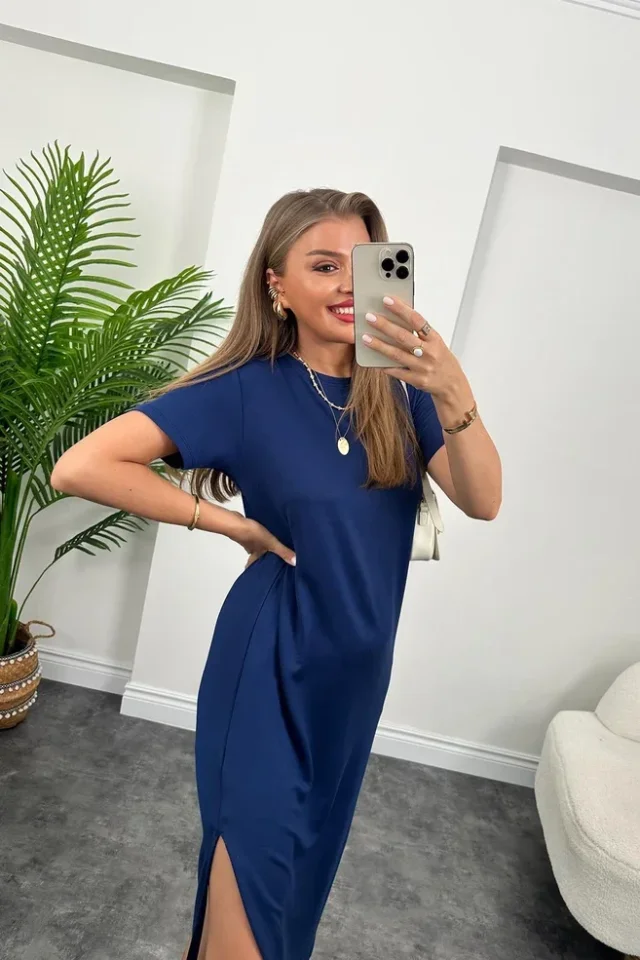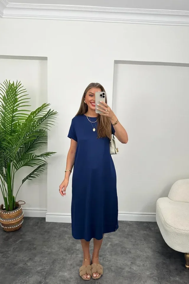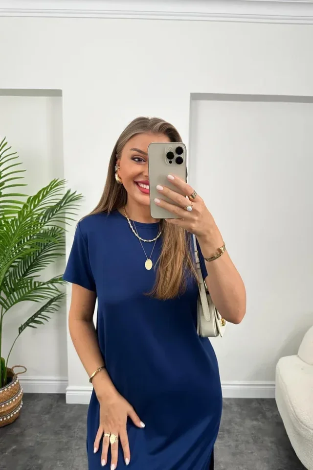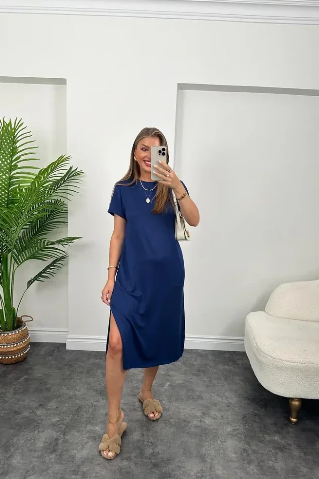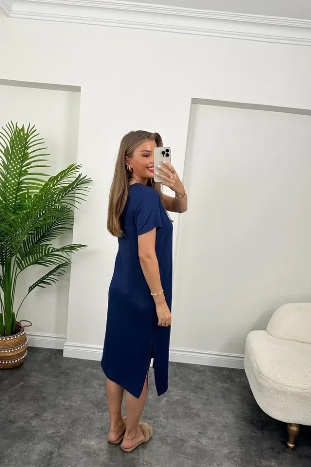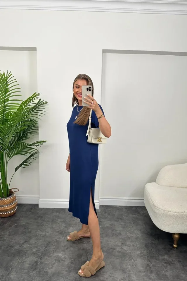 Kadın Kısa Kollu Yırtmaç Detaylı Salaş Viskon Elbise