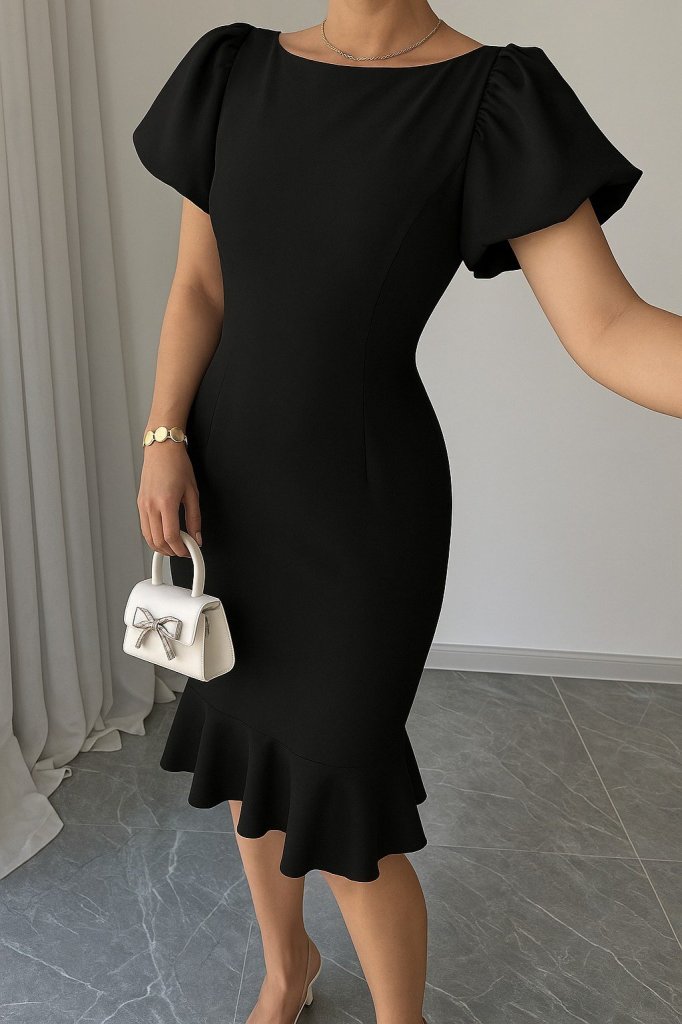 Kadın Kısa Kollu Yuvarlak Yaka Pileli Janjan Krep Elbise