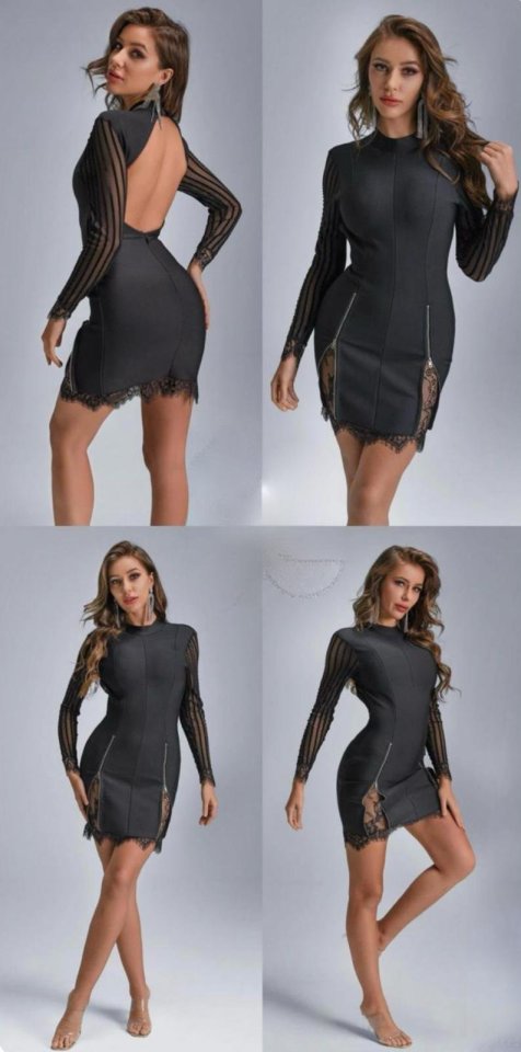 Kadın Kolları Ve Etek Ucu Dantel Detay Fermuar Dekolteli Skuba Kumaş Mini Elbise