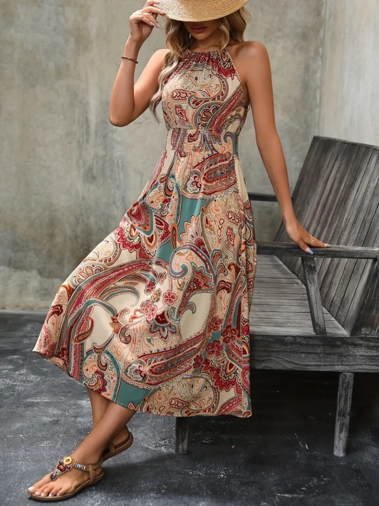 Kadın Kolsuz Boyundan Bağlamalı Beli Lastikli Etnik Desen Baskı Süprem Uzun Elbise