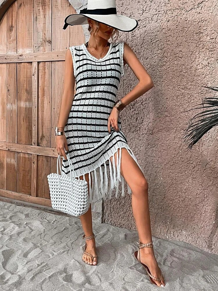Kadın Kolsuz V Yaka Eteği Püsküllü çizgi Desen Triko Elbise