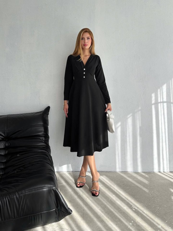 Kadın Krep Kumaş Düğme Detaylı V Yaka Uzun Kollu Midi Boy Elbise