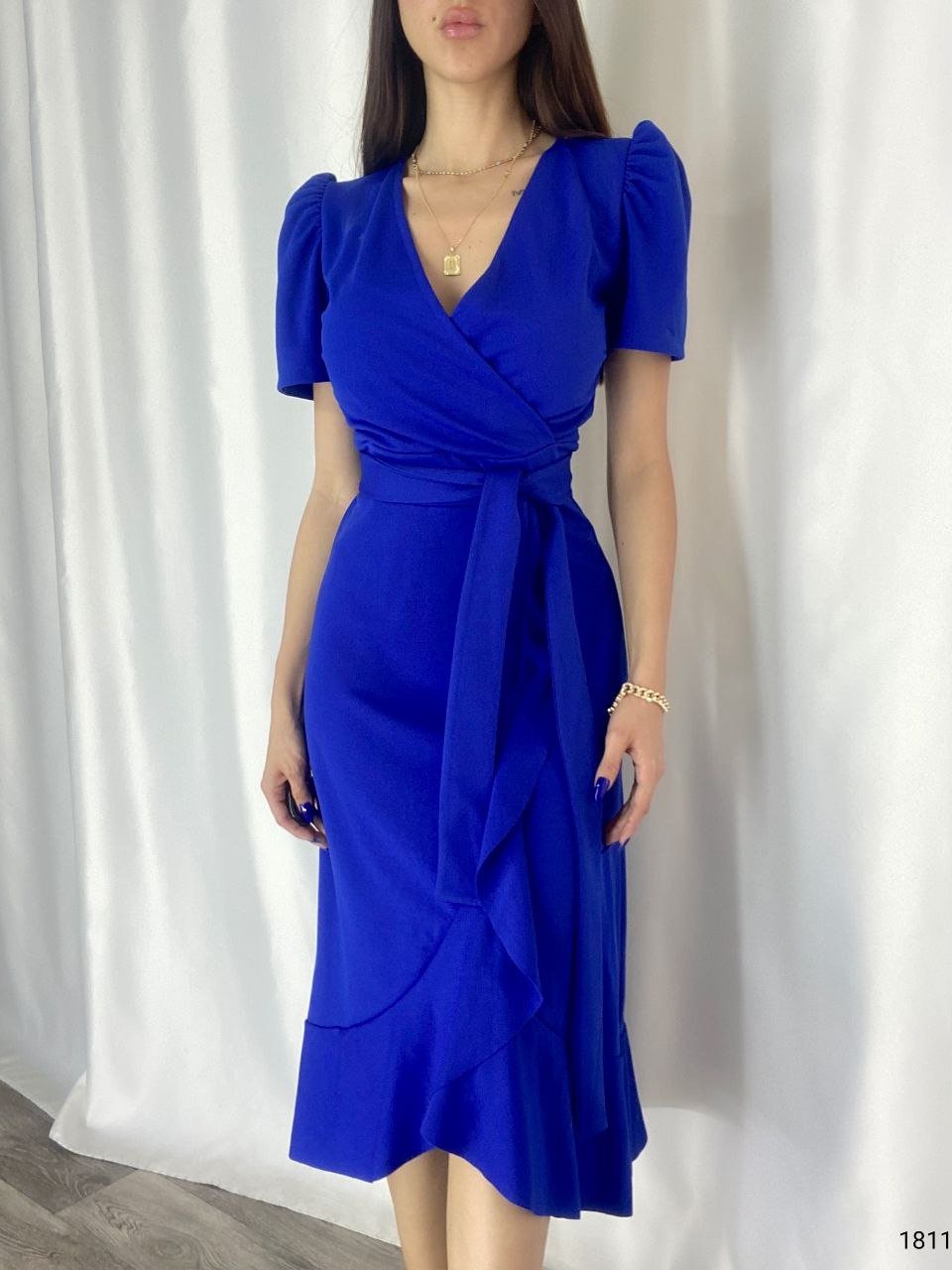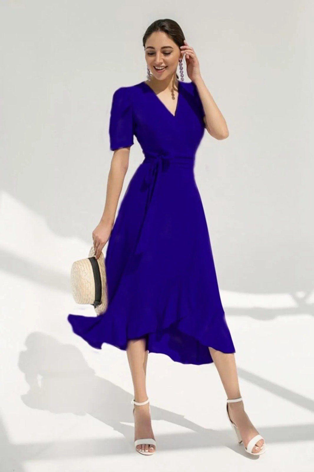 Kadın Kruvaze Yaka Midi Boy Kuşaklı Krep Elbise 120 Cm