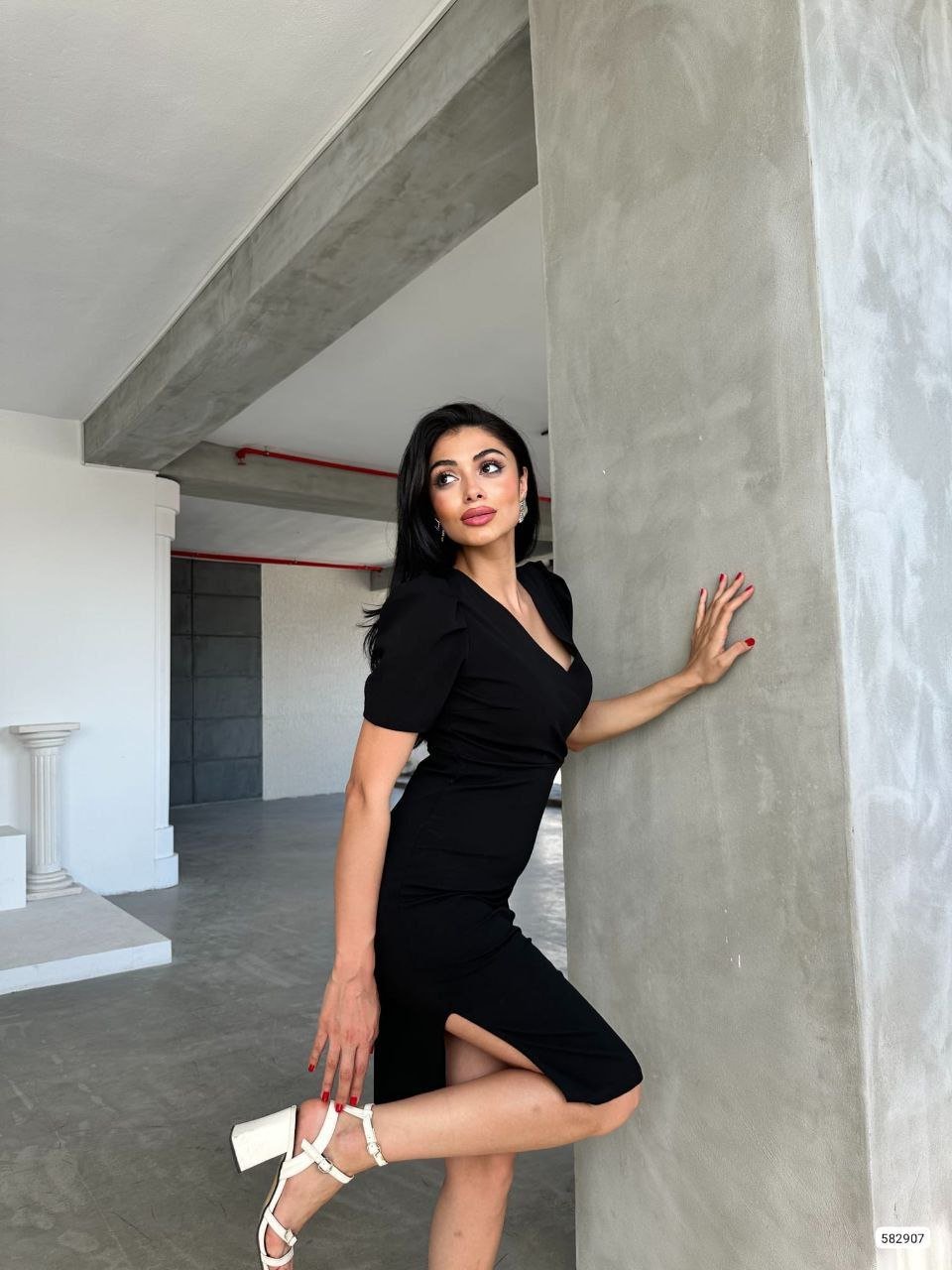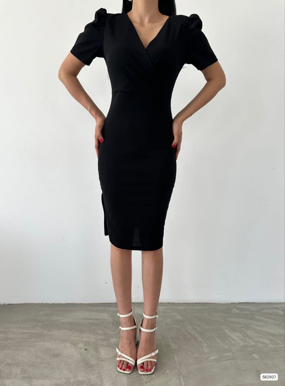Kadın Kruvaze Yaka Yandan Yırtmaç Detaylı Scuba Krep Kumaş Midi Boy Elbise