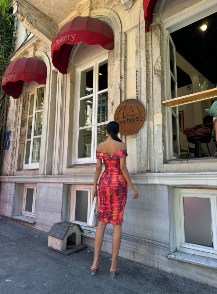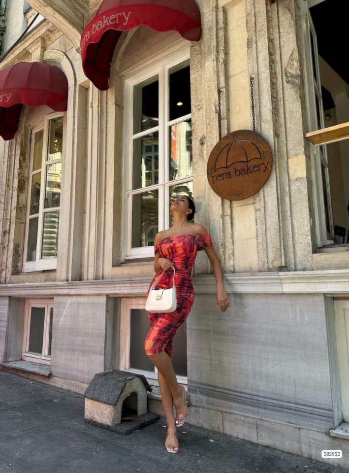Kadın Madonna Yaka Dalga Desen Midi Boy şifon Elbise