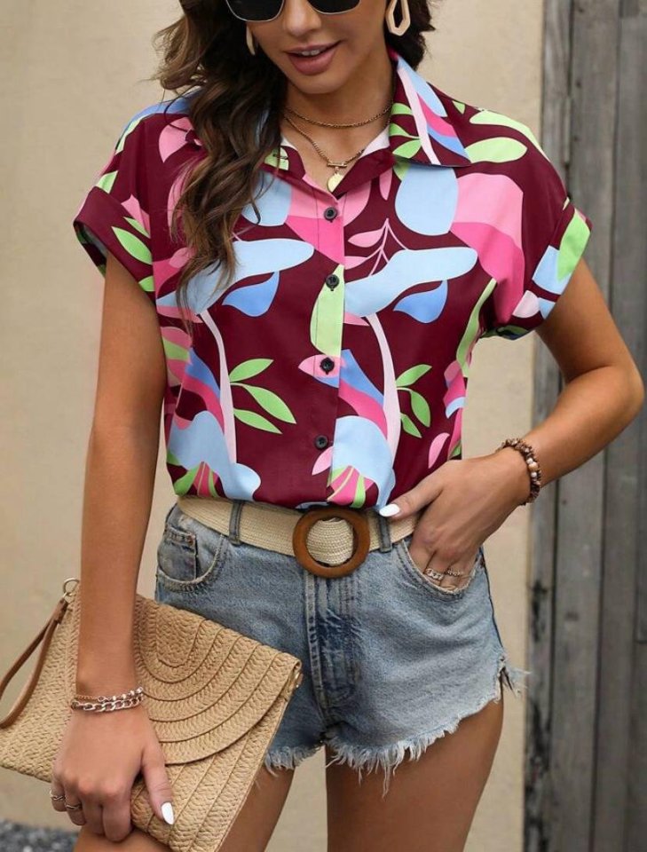 Kadın Moss Krep Kumaş Kısa Kol Çiçek Desenli Gömlek