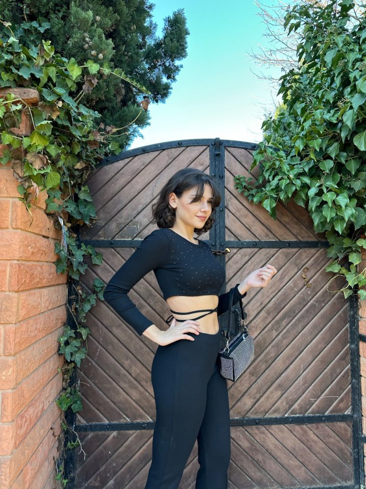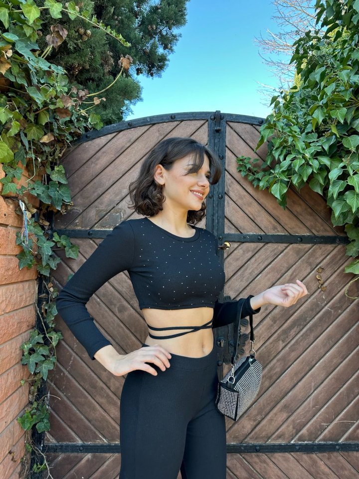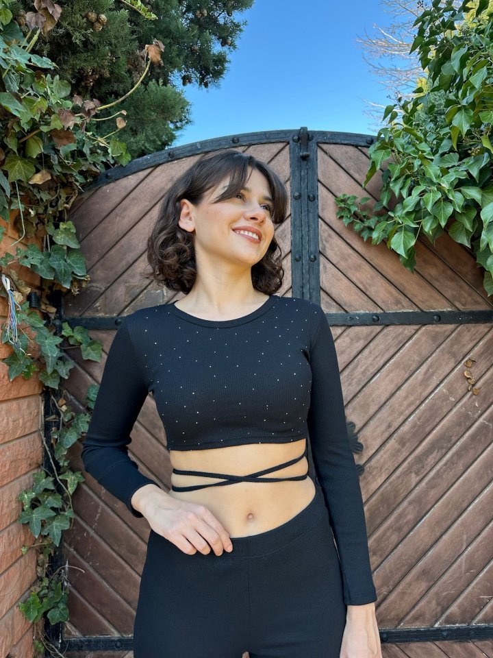 Kadın Paçası Yırtmaç Detaylı Taşlı Bel Bağlamalı Kaşkorse İkili Takım