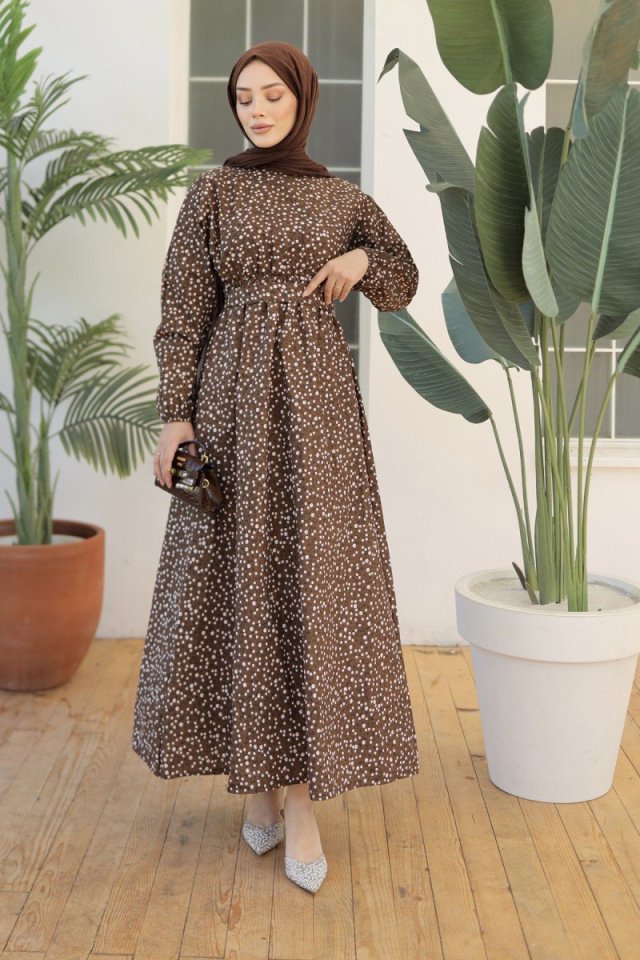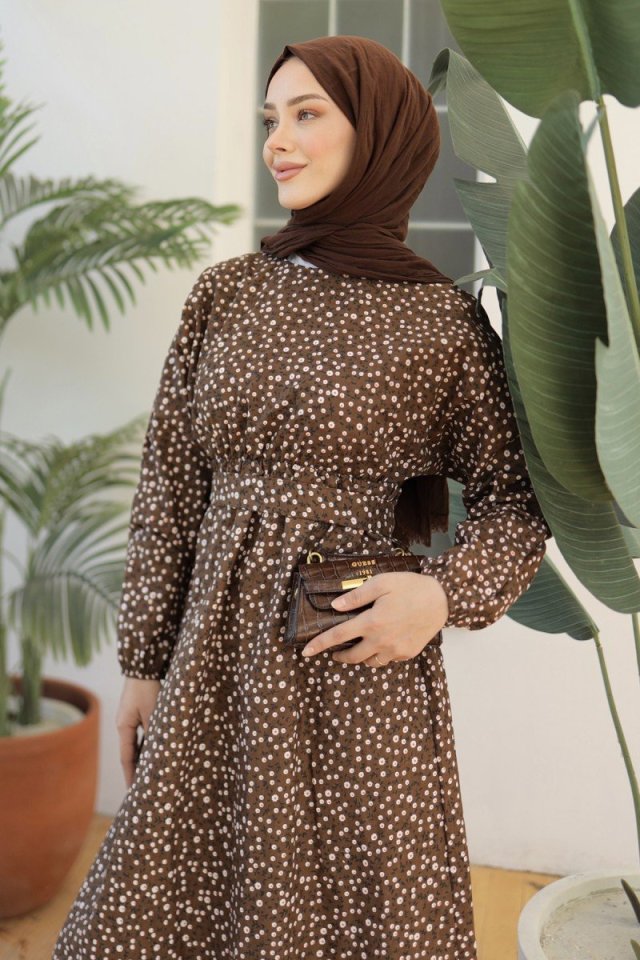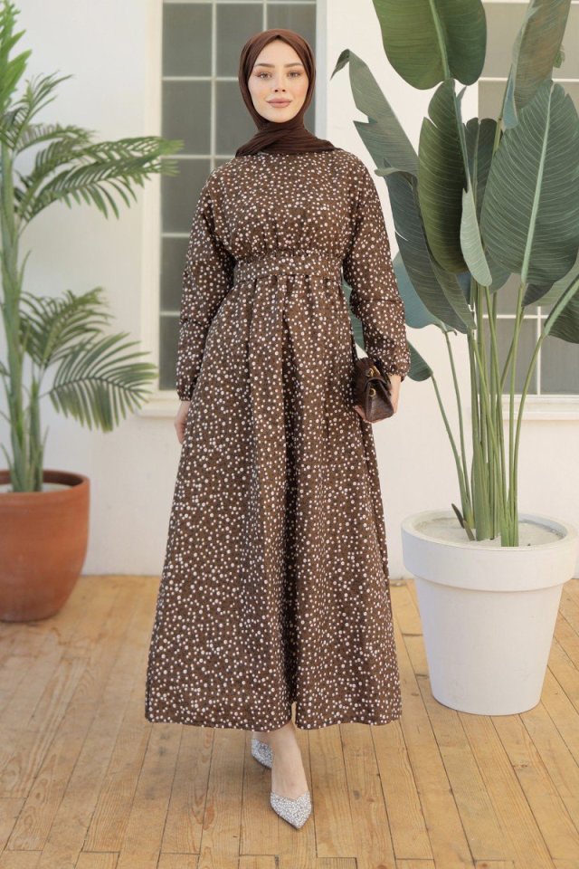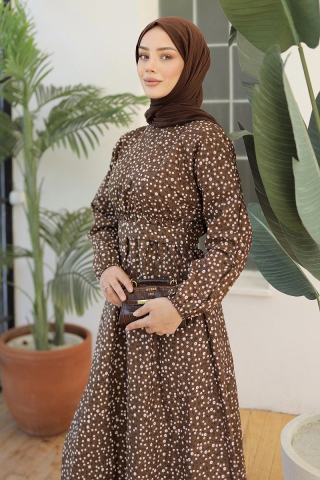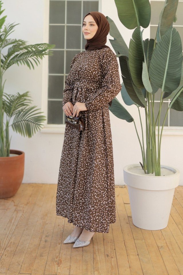 Kadın Papatya Desen Bisiklet Yaka Belden Bağlamalı Elbise