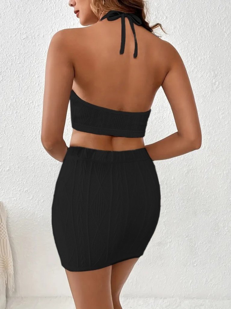 Kadın Sıfır Kol Crop Mini Etek Ikili Triko Takım