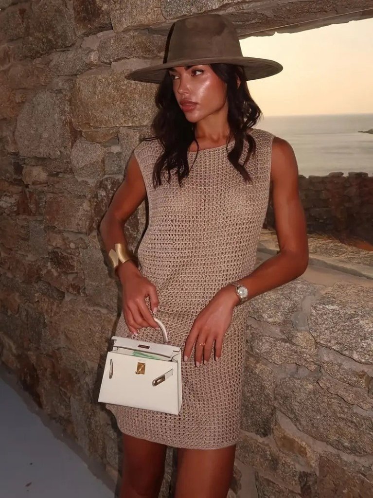 Kadın Sıfır Kol Yanlardan Halka Toka Detaylı Triko Plaj Elbisesi