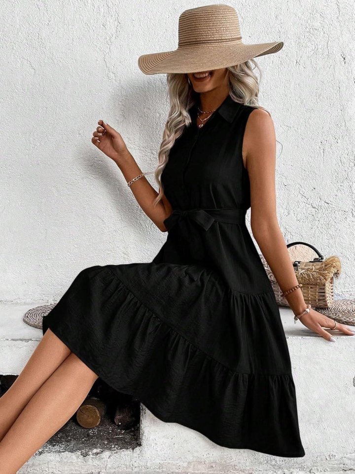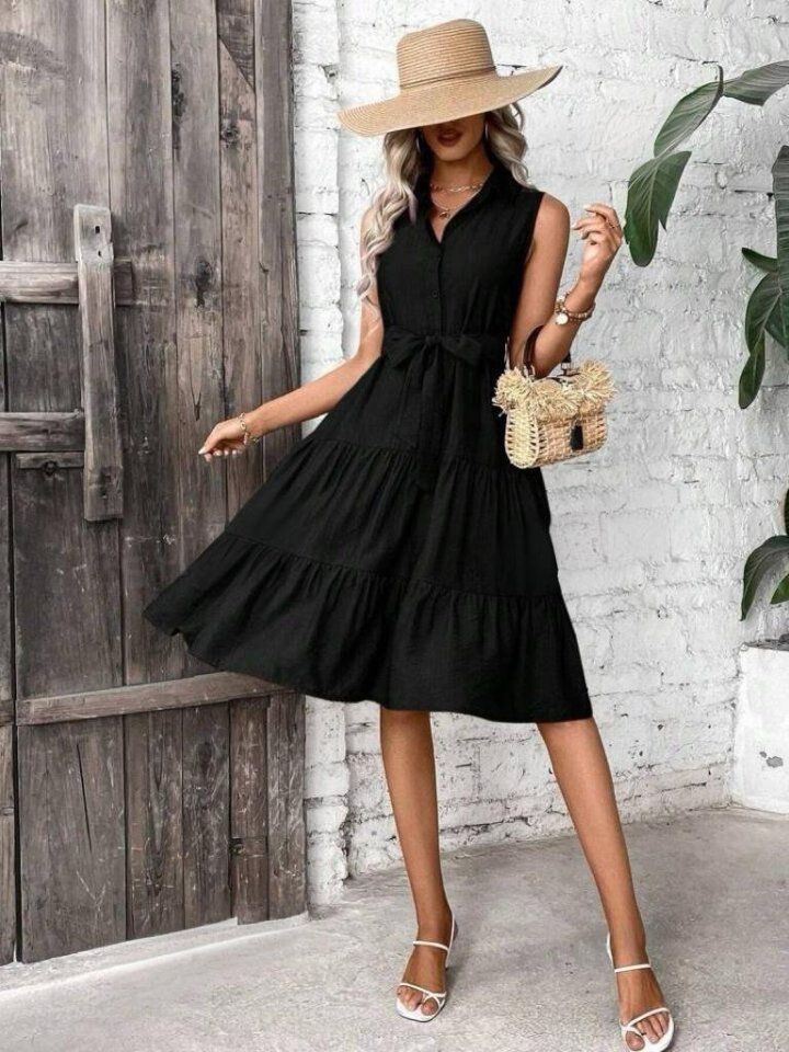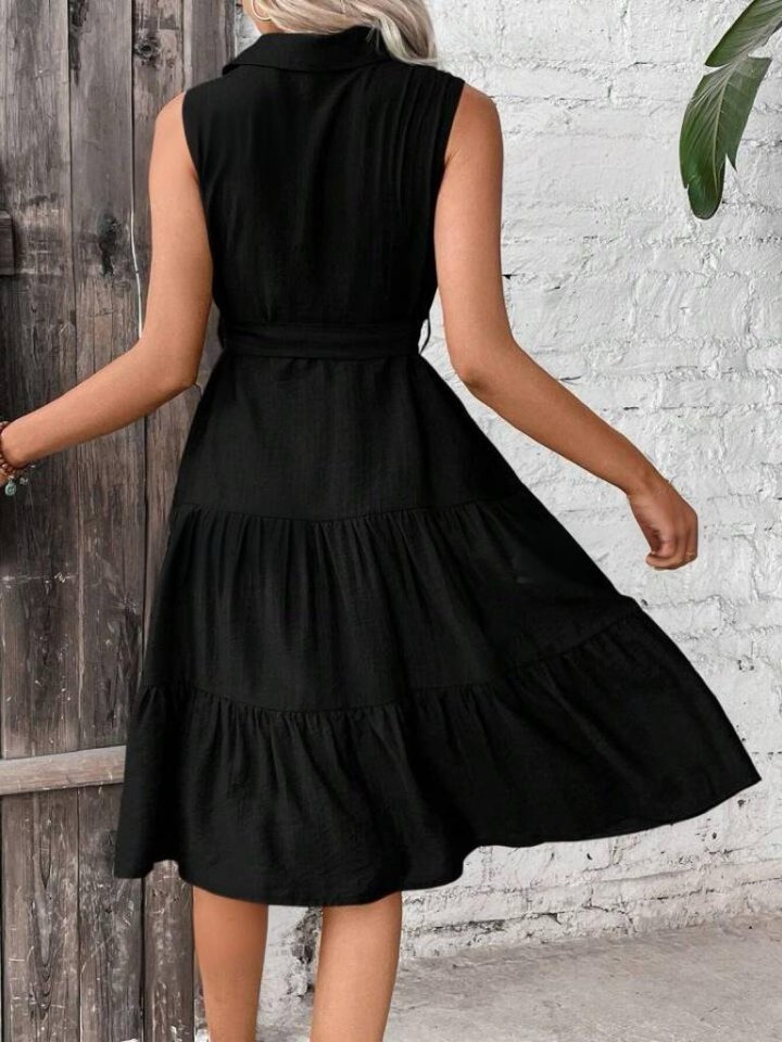 Kadın Sıfır Kollu Gömlek Yaka Düğmeli Beli Kuşaklı Katlı Dokuma Midi Elbise