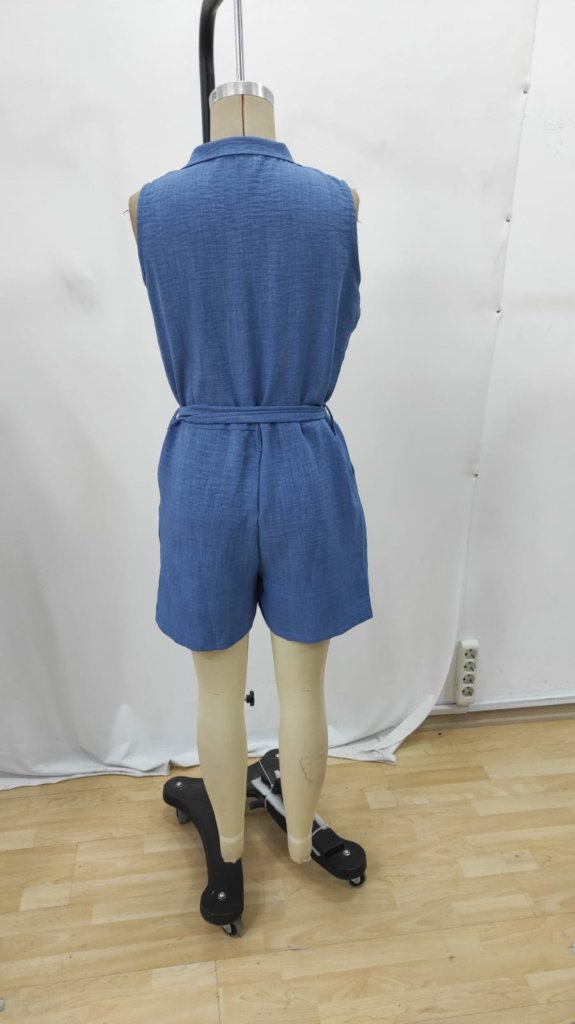 Kadın Sıfır Kollu Yakalı Düğmeli Belden Kuşaklı Kısa Keten Tulum