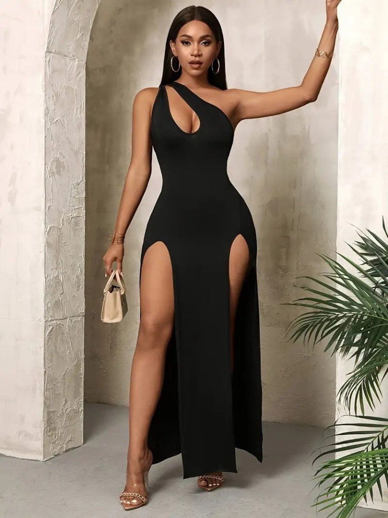 Kadın Tek Omuzdan Açık Damla Detaylı Yırtmaç Detaylı Uzun Janjan Krep Elbise