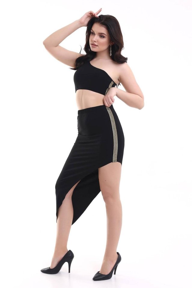 Kadın Tek Omuzlu Asimetrik Etek Şerit Detaylı Fırsat Ürün Sandy Kumaş İkili Takım