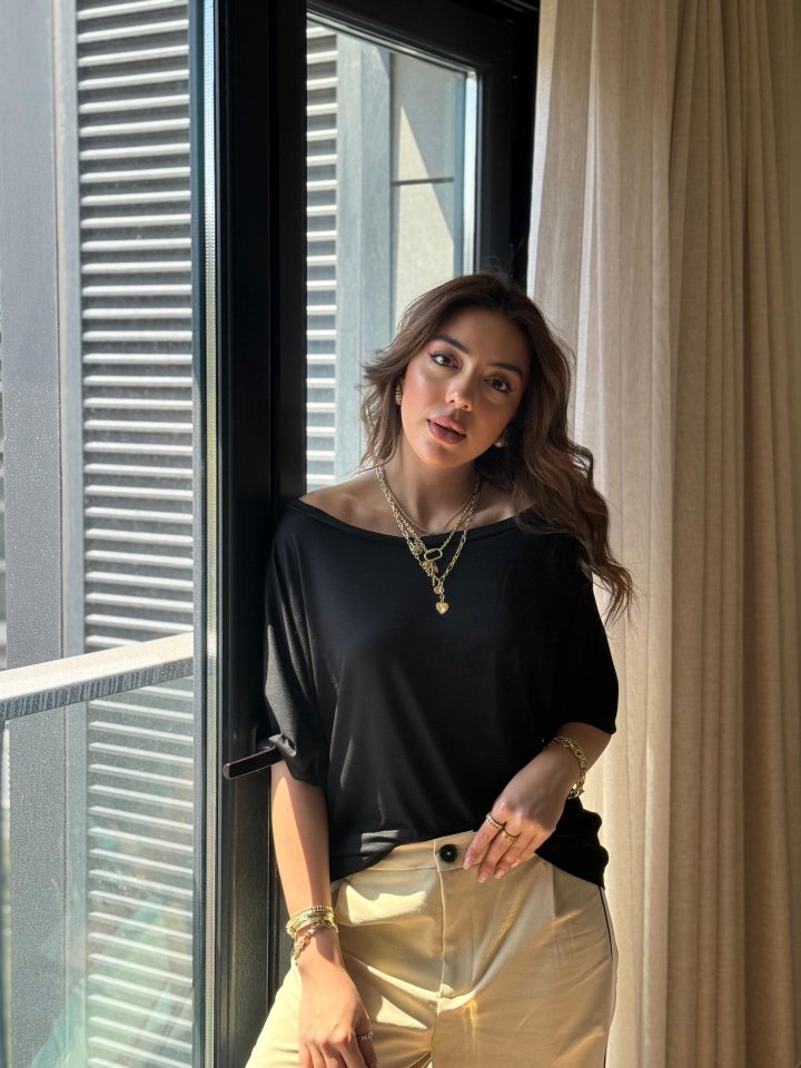 Kadın Tek Omuzu Açık Kısa Kollu Salaş Viskon Bluz