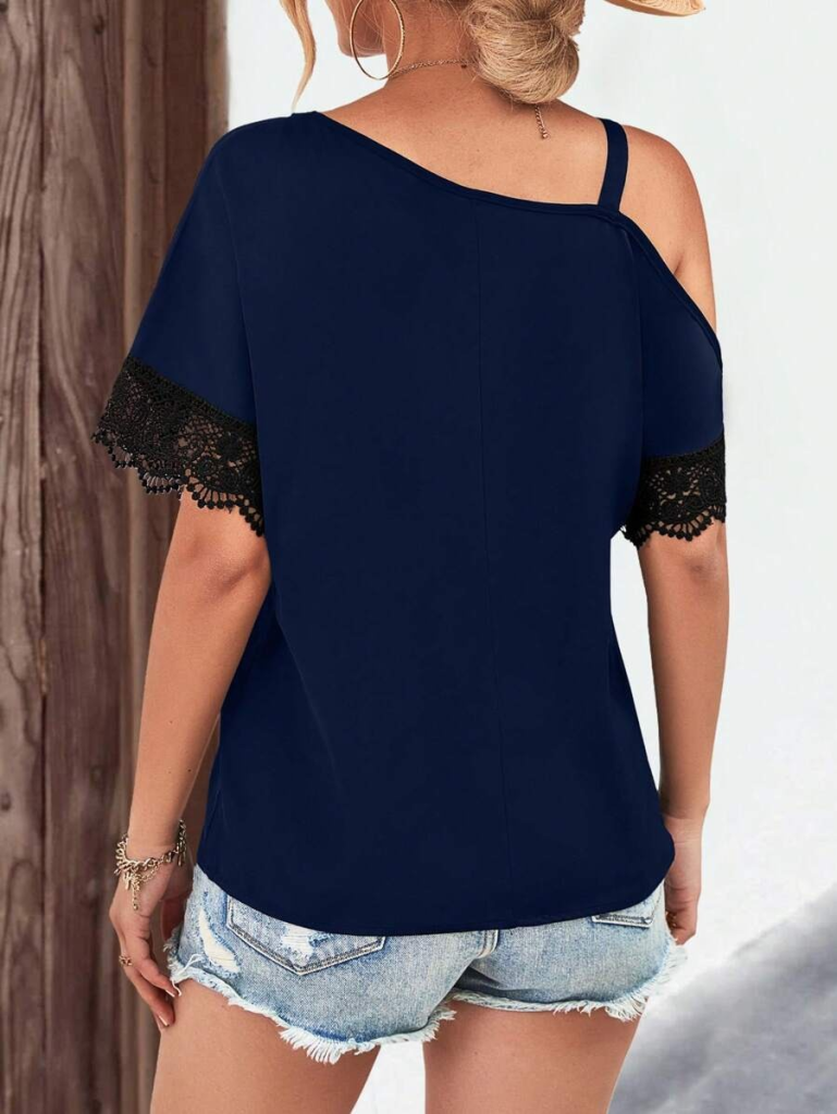 Kadın Tek Omuzu Askılı Kısa Kollu Toka Detaylı Dantelli Viskon Bluz
