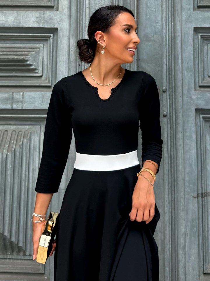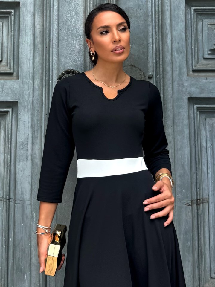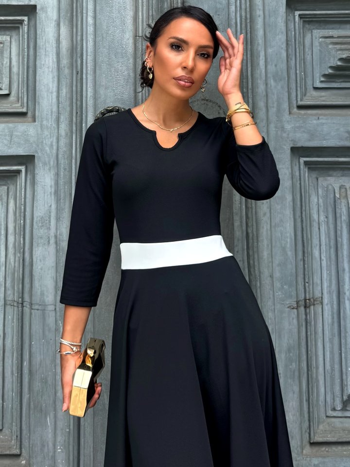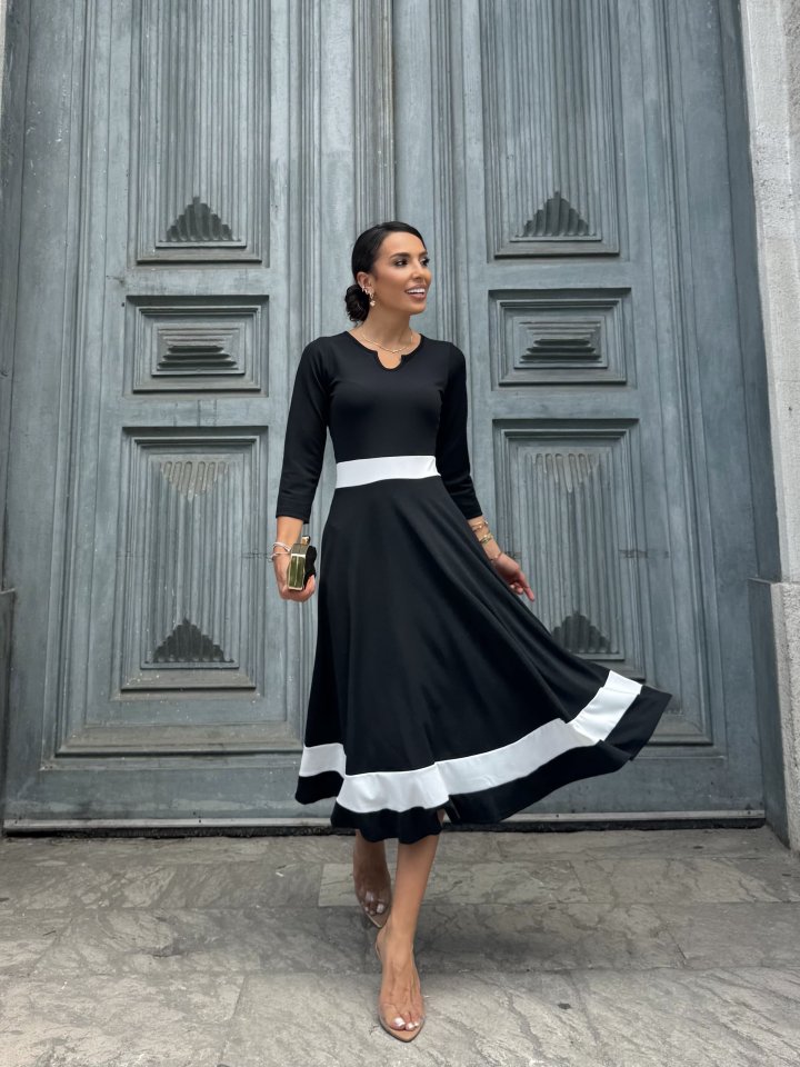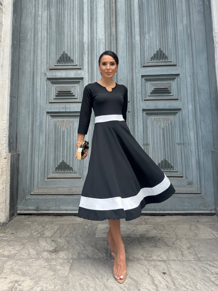 Kadın Truvakarkol Yakası Açık Blok Renkli Krep Midi Elbise