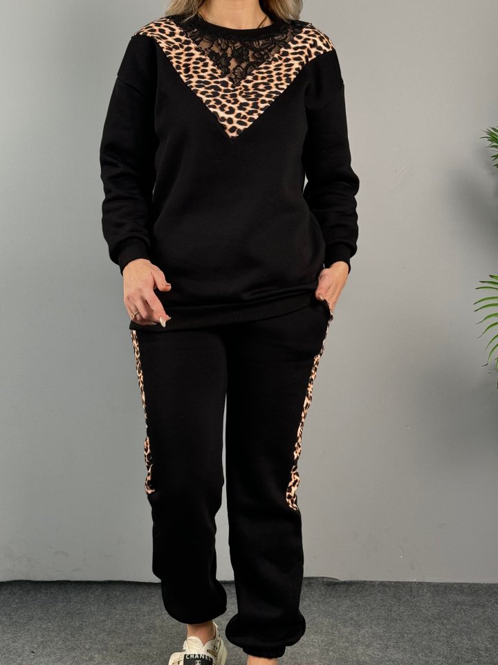 Kadın üç Iplik Kumaş Leopar Desenli Dantel Detaylı Ikili Takım
