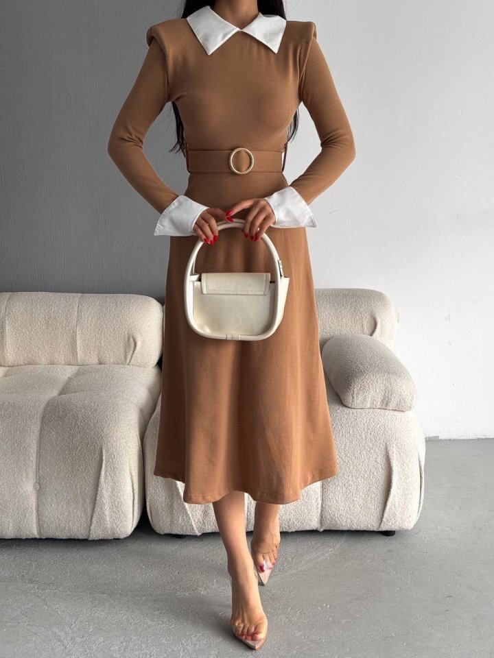 Kadın Uzun Kol Gömlek Yaka Ve Vatka Detay Kemer Dahil Midi Boy Elbise