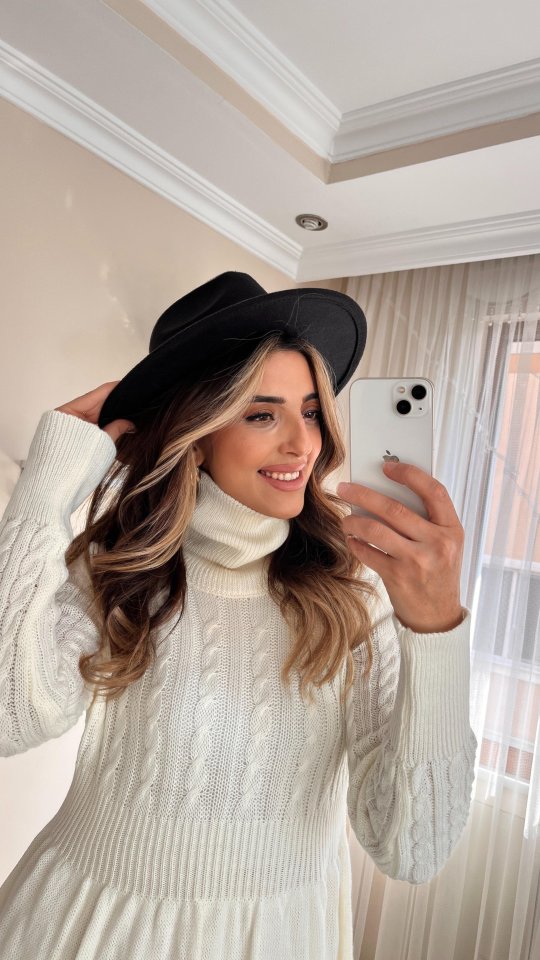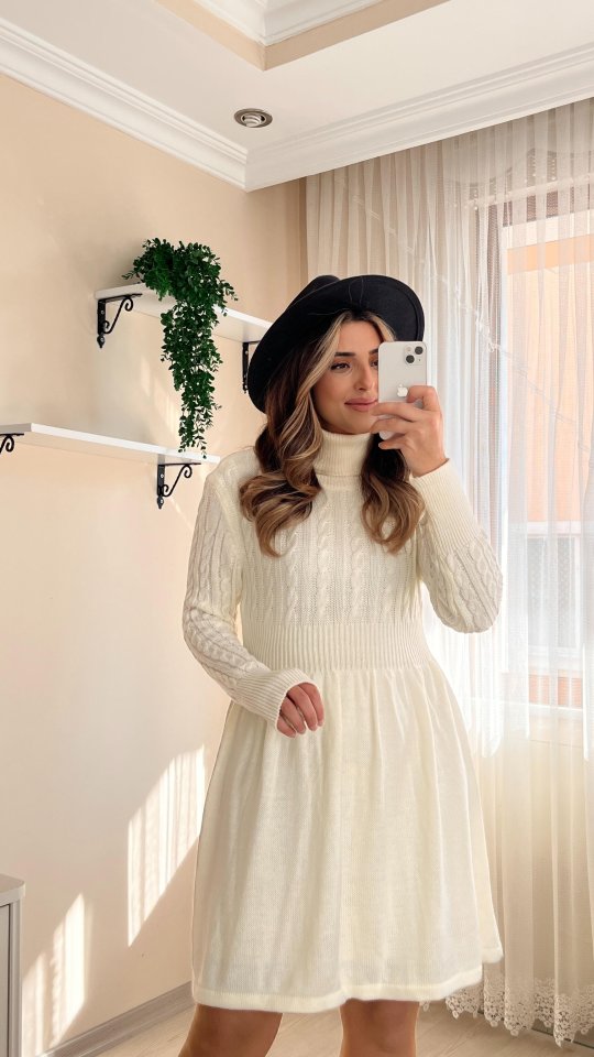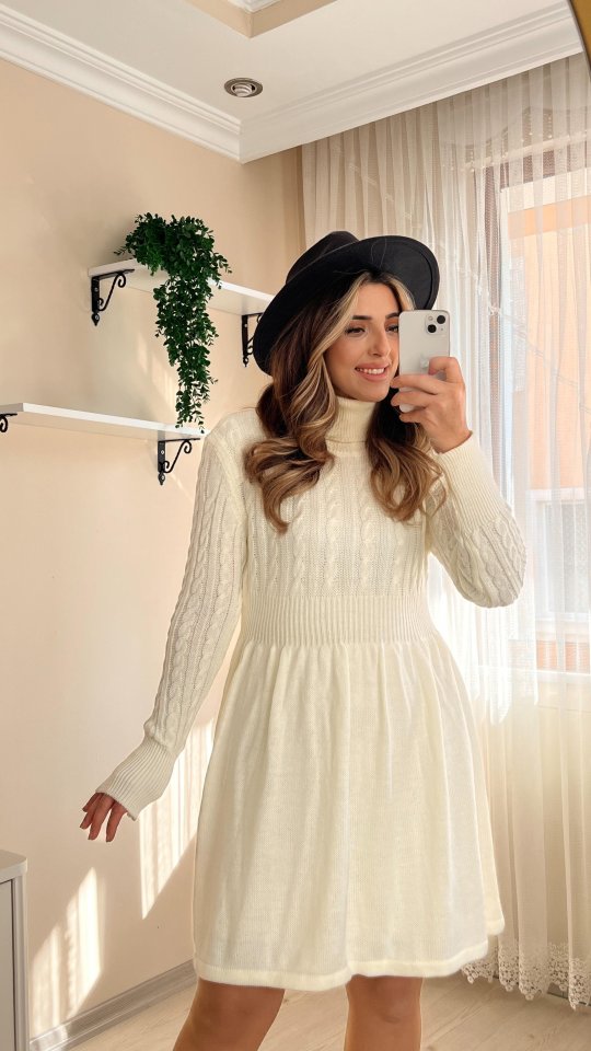 Kadın Uzun Kollu Balıkçı Yaka Belden Yaka Belden Büzgülü Kısa Triko Elbise