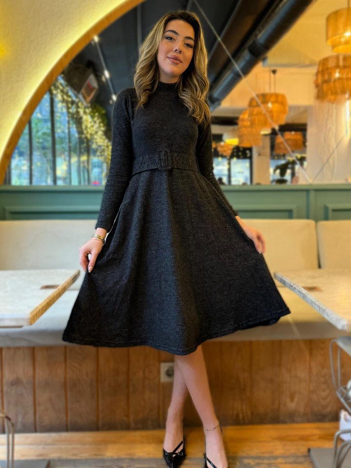 Kadın Uzun Kollu Balıkçı Yaka Kemer Detaylı Yumoş Midi Elbise