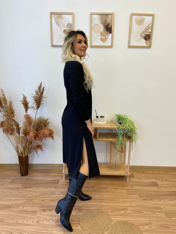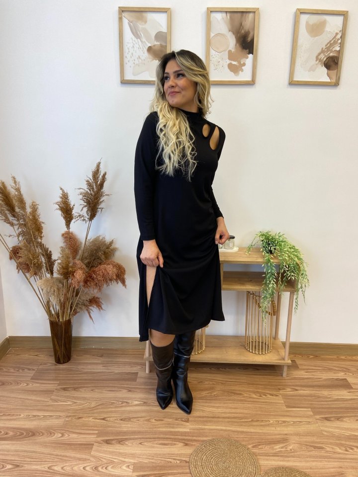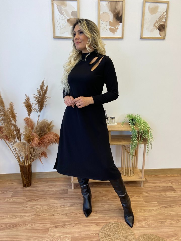 Kadın Uzun Kollu Balıkçı Yaka Omuzda Damla Detaylı Yırtmaçlı Krep Midi Elbise