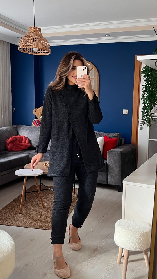 Kadın Uzun Kollu Balıkçı Yaka önden Düğmeli Bluz Ve Pantolon Yumoş Ikili Takım