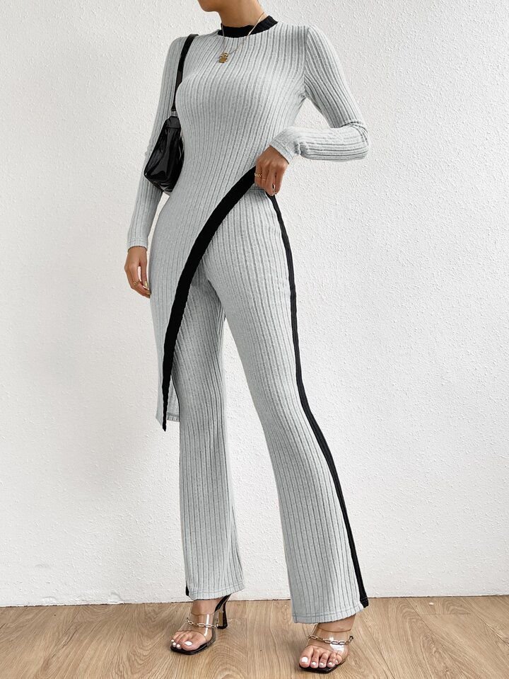 Kadın Uzun Kollu Bisiklet Yaka Asimetrik Kesim Bluz şardonlu Kaşkorse Bluz Ve Pantolon Ikili Takım